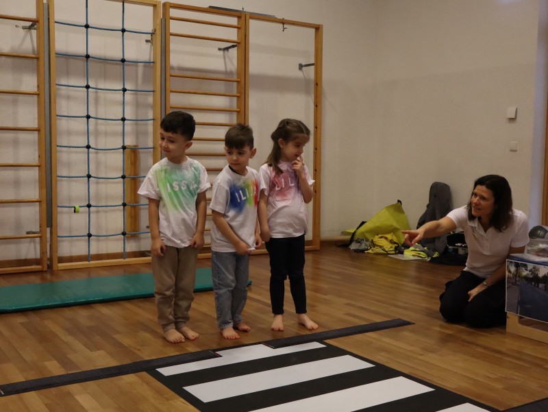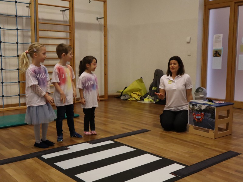 Die Kinder konnten auch ausprobieren, wie verhalte ich mich bei einem Zebrastreifen. Sie bleiben stehen, sie schauen links-rechts-links, sie überqueren danach zügig, ohne zu laufen, die Straße.