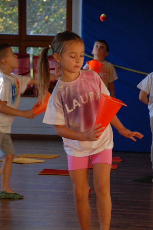 In der nächsten Runde wurde es spannend! Die Kinder versuchen, mit kleinen Verkehrshütchen einen Tennisball auf unterschiedliche Weise zu fangen. Verschiedene Techniken werden ausprobiert, was die Geschicklichkeit und Koordination fördert.