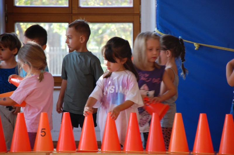 Dann sind im Team verschiedene Verkehrshütchen mit Nummern zu finden. Zahlen von 0-9 werden gesucht und gefunden, denn bereits in der Lernwerkstatt konnten die Ziffern kennengelernt und vertieft werden.