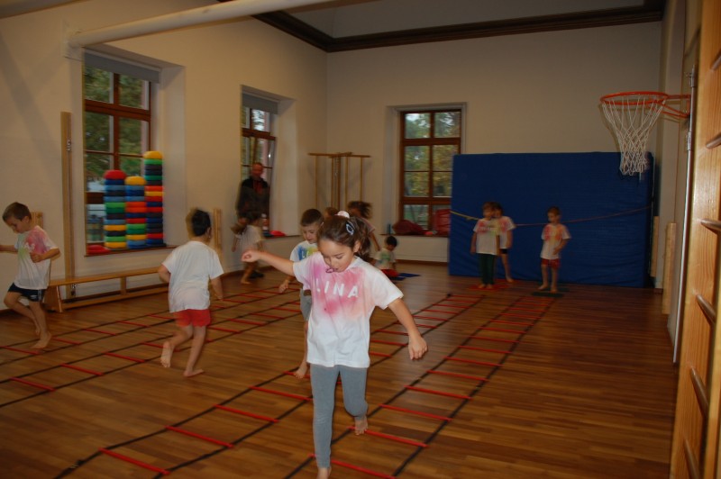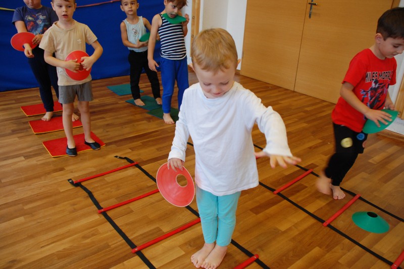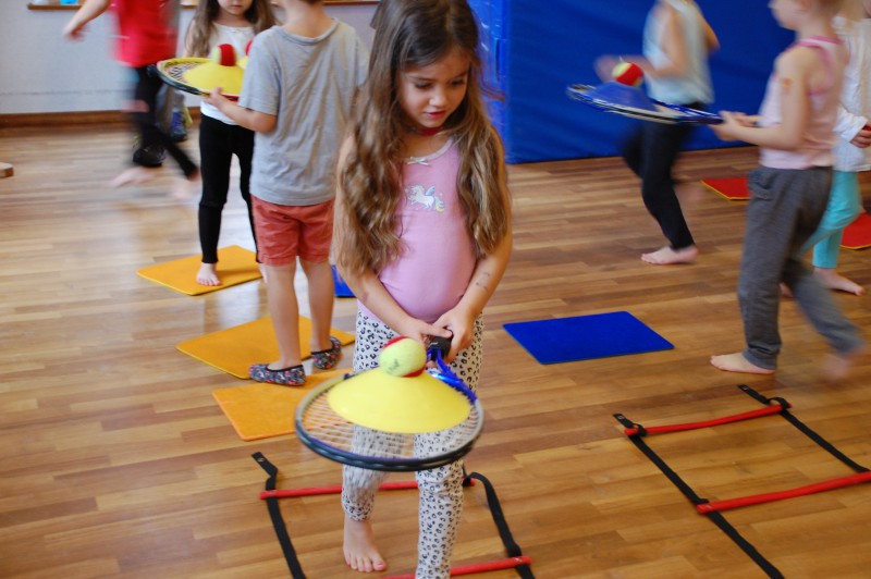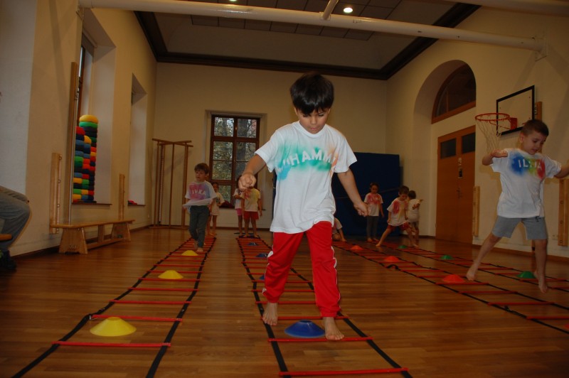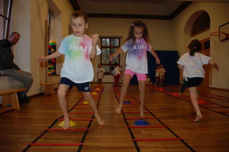 Der Schwerpunkt der heutigen Einheit war Koordination. Dafür wurden 4 Koordinationsleitern aufgebaut (parallel zueinander). Vor jeder Koordinationsleiter lagen jeweils 3 Teppichfliesen, gelbe, blaue, rote und grüne. Zuerst durften die Kinder 10 Runden ganz gemütlich um die Koordinationsleitern laufen, hier wurde darauf geachtet wie sich die Kinder ihre Kraft und ihre Luft selbst einteilen. Im Anschluss wurden die Kinder auf die Teppichfliesen aufgeteilt, also in 4 Gruppen aus jeweils 3 Kindern. Sie durften durch die Koordinationsleiter laufen, der Schwierigkeitsgrad wurde dabei stetig erhöht, so wurde die Leiter zuerst normal durchlaufen, dann seitlich. Danach bekam jede Gruppe 5 Hütchen die sie in einem bestimmten Abstand auf der Leiter verteilen mussten. Hier wurde das eigene Denkvermögen geprüft und Lösungsstrategien wurden entwickelt. Am Ende bekam jedes Kind einen Tennisschläger, ein Hütchen und einen Tennisball. Dies wurde aufeinander gestapelt und die Kinder konnten ihre Geschicklichkeit und ihr Gleichgewicht auf die Probe stellen, indem sie mit dem Schläger durch die Koordinationsleiter liefen.