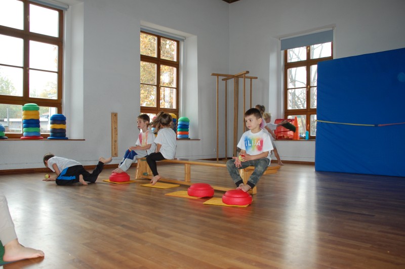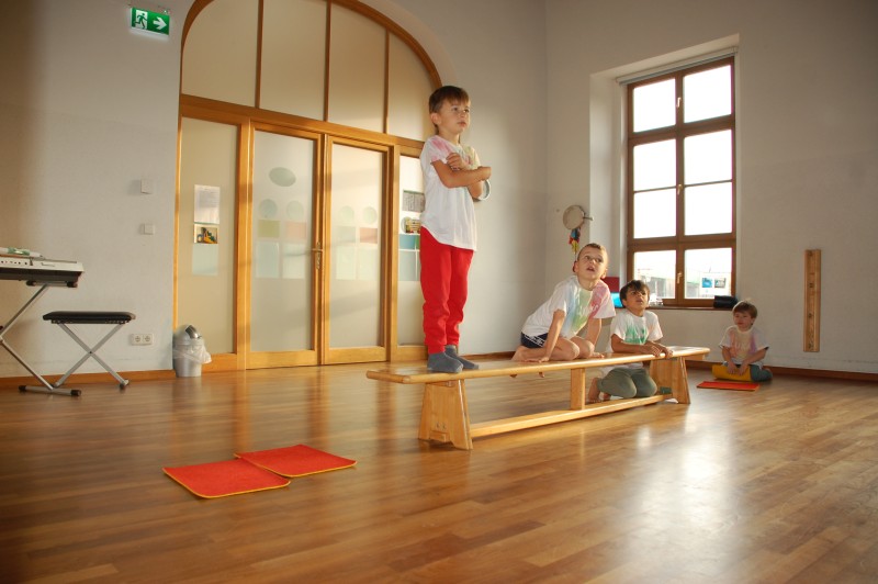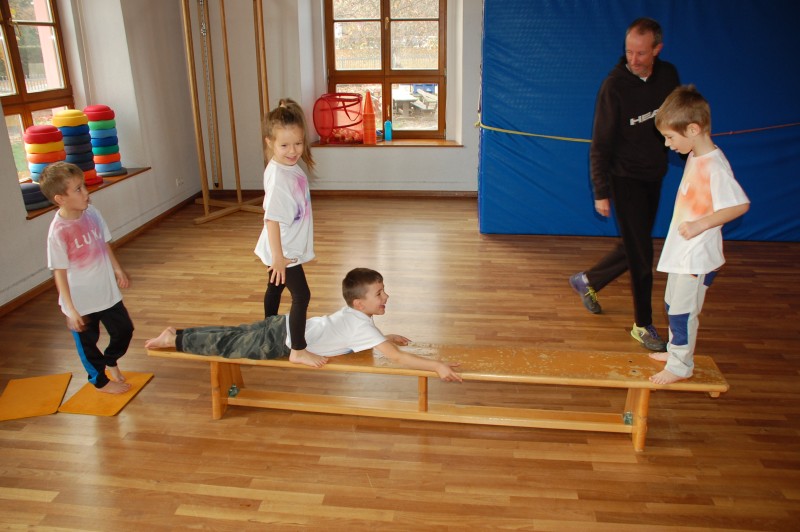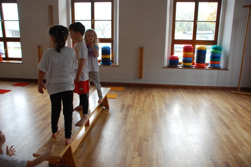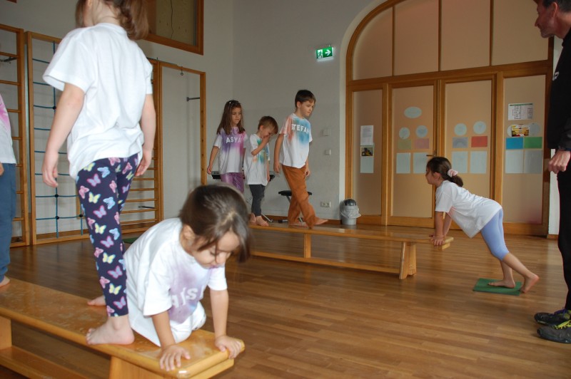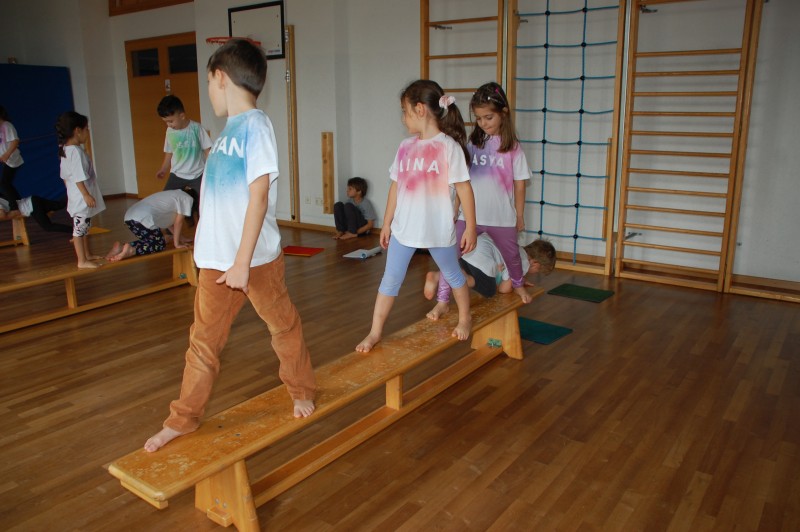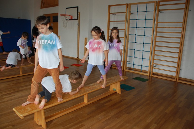 Anschließend wurden die Kinder in 3 Gruppen mit unterschiedlichen Farben eingeteilt. Nun durften sie ihren Gleichgewichtssinn trainieren, indem sie auf der Bank balancierten und sich gegenseitig ausweichen mussten. Dies erforderte nicht nur ein gutes Gleichgewicht, sondern auch Achtsamkeit füreinander sowie gegenseitige Unterstützung, dabei stärkten die Kinder ihre soziale Kompetenz.