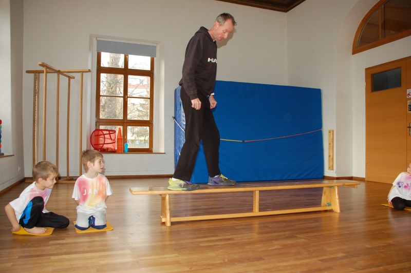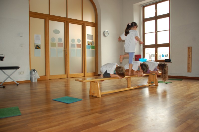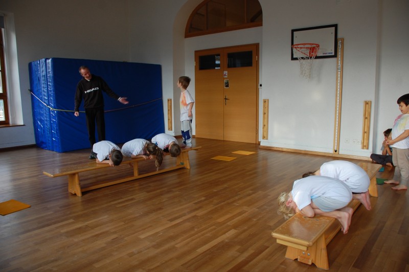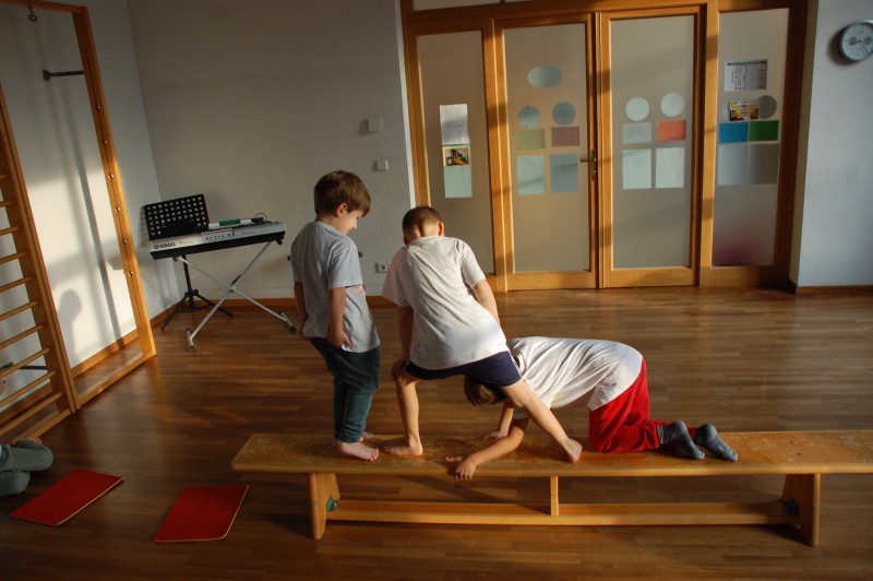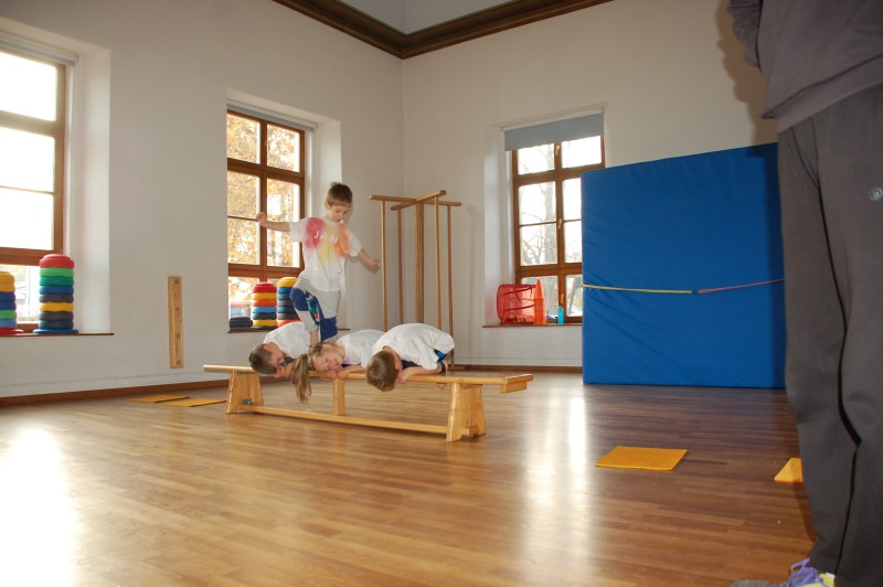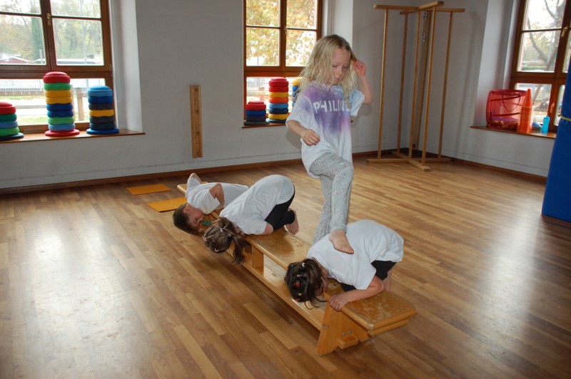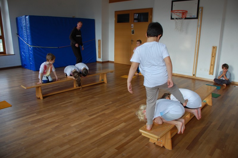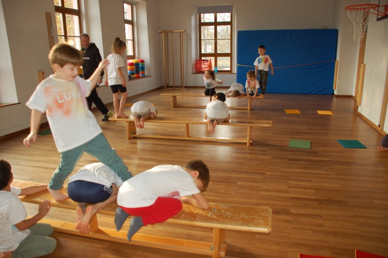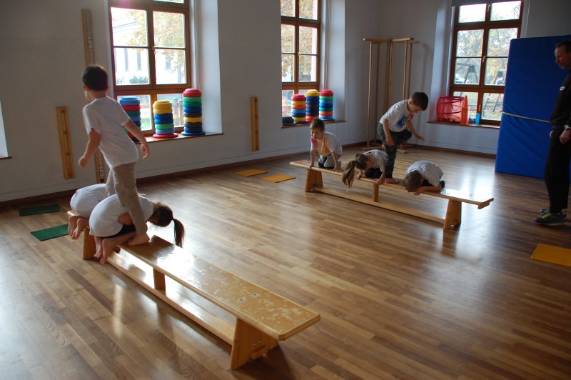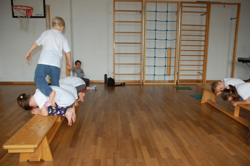 Zu Beginn hatten die Kinder die Möglichkeit sich erst einmal auszupowern, in dem sie den Auftrag bekamen über die Bänke oben drüber und unten durch zu klettern.