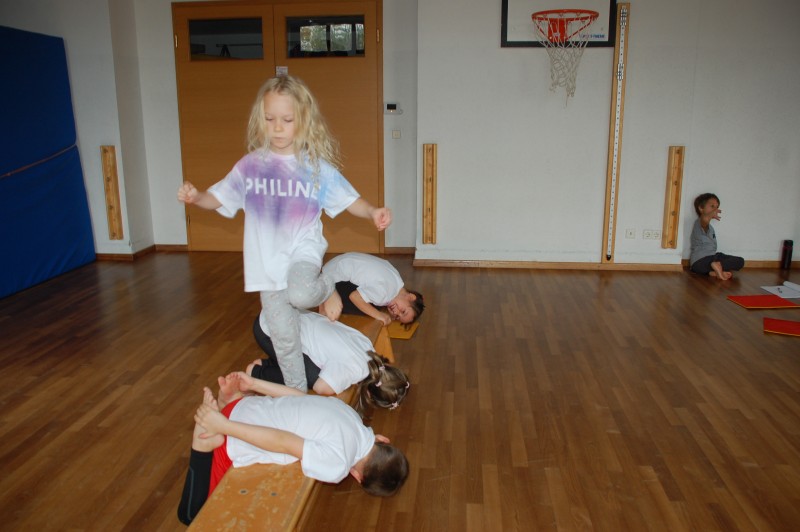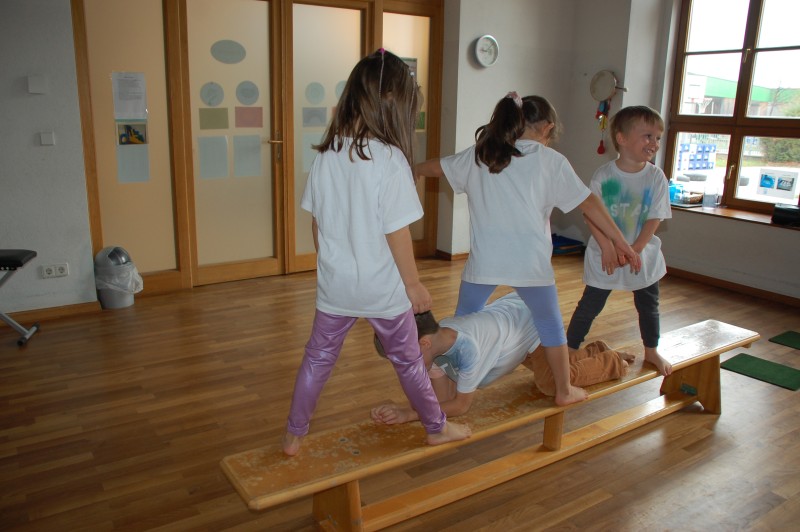 Danach wurde auch die Koordination der Kinder auf die Probe gestellt, denn nun versteinerten 3 Kinder auf der Bank zu Steinen, die überstiegen werden mussten. Wenig später wurden sie zu Tunneln. Hier galt es unten durch zu kriechen. Dies gestaltete sich gar nicht so einfach, auch hier mussten die Kinder gut aufeinander achten, denn sonst stürzte der Tunnel ein.