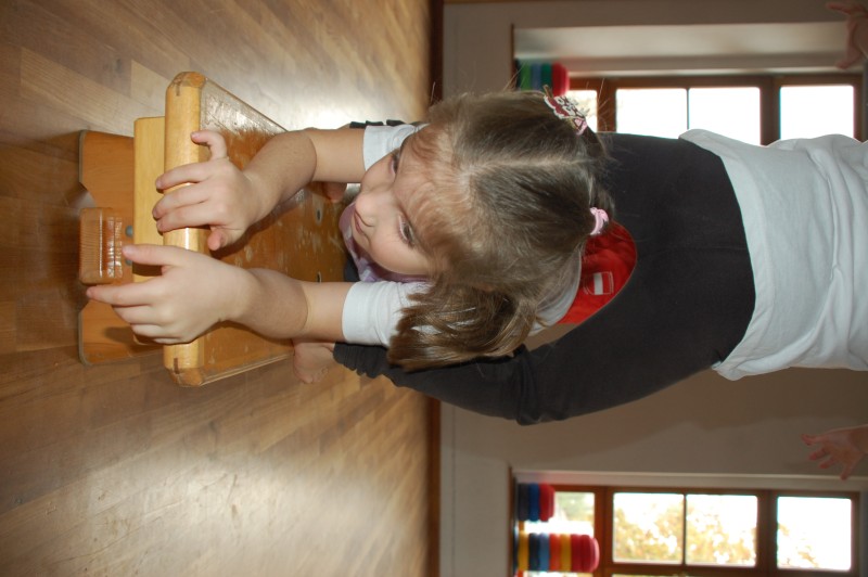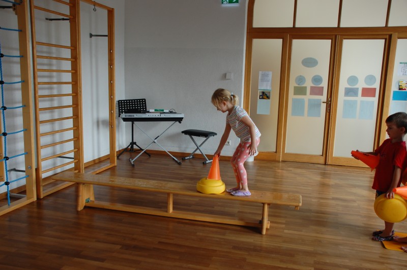 Als nächstes balancierten die Kinder Kegel auf einem Stapelstein, und schoben diesen vorsichtig mit den Füßen über die Bank.