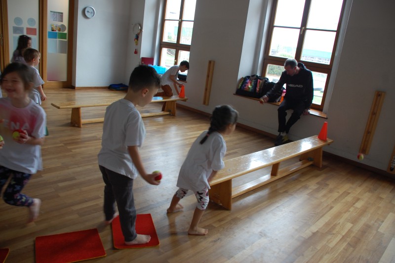 Zu guter Letzt gab es ein Auge-Hand-Koordination bzw. Kraftdosierungs-Übung mit dem Tennisball. Die Kinder standen auf der Bank und bekamen die Aufgabe den Tennisball auf ihre Teppichfliese zu prellen und wieder zu fangen. Für die Profis wurde der Schwierigkeitsgrad erhöht und noch ein Stapelstein ergänzt, jetzt mussten sich die Kinder an den „Abprallwinkel“ anpassen. Auch diese Übung, war recht herausfordernd, sorgte aber trotzdem für viel Spaß, der ja beim Lernen niemals fehlen darf =).