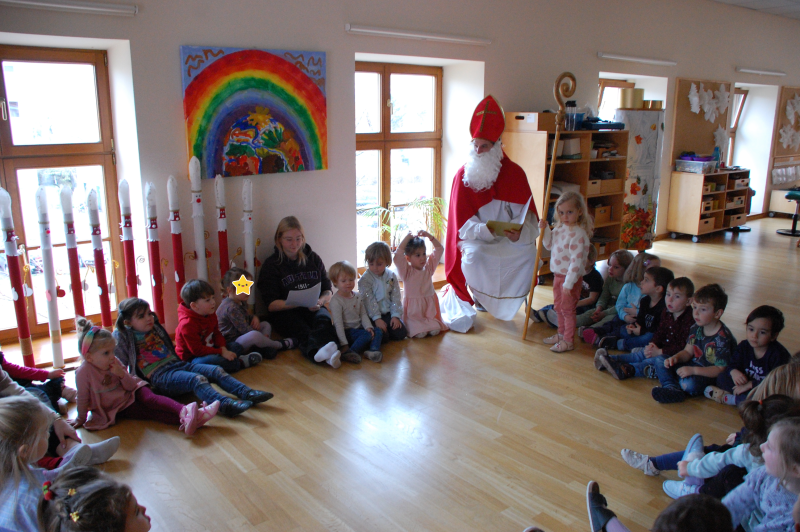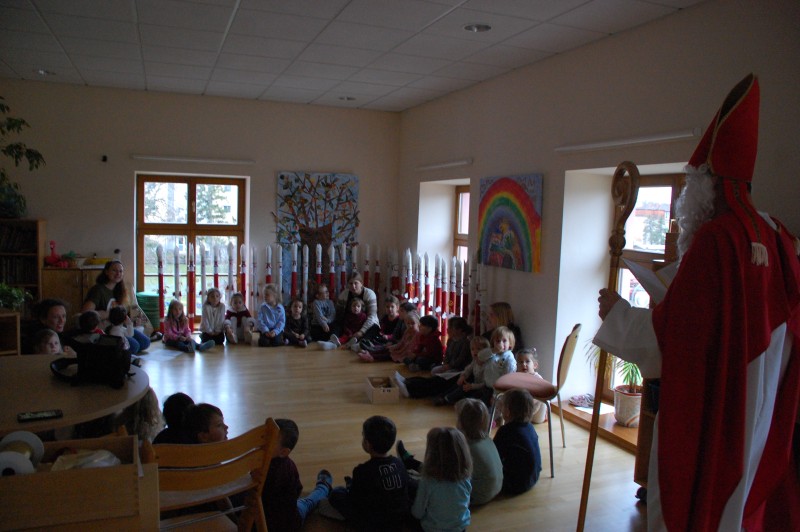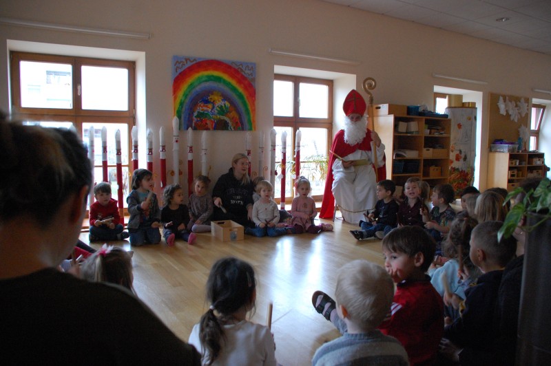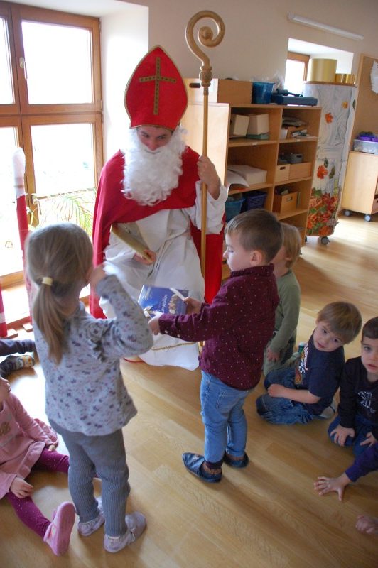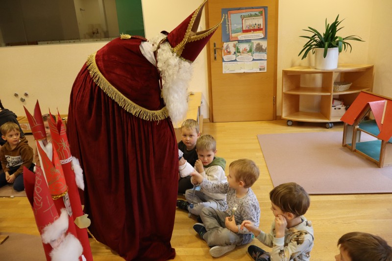 Nikolaus wurde von allen Kindern fleißig mit Liedern und Gedichten beschenkt und dafür konnten die Kinder heute ihre gebastelten Nikolos in Empfang nehmen.