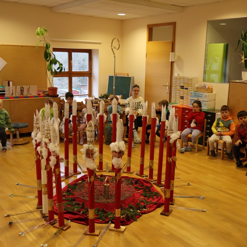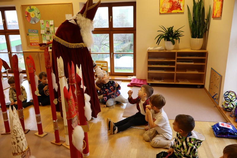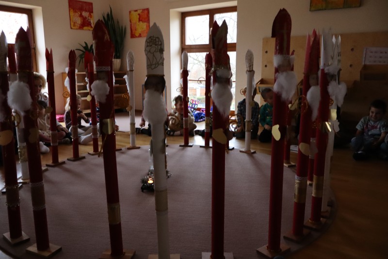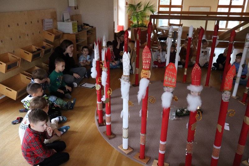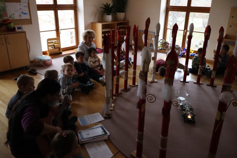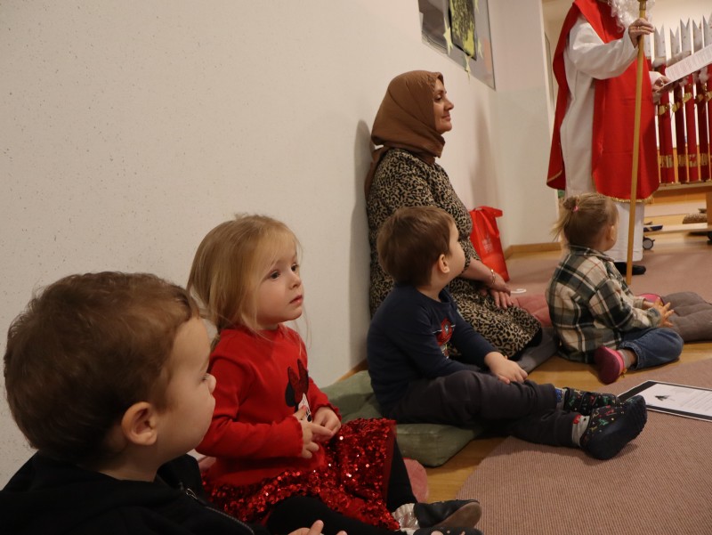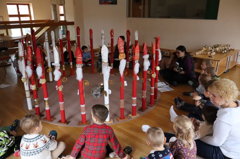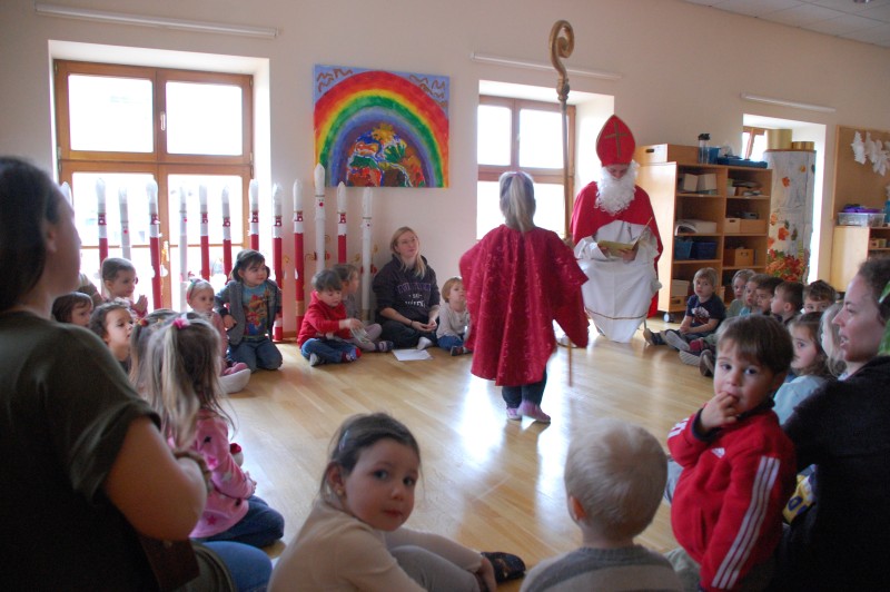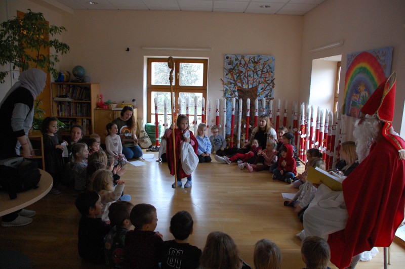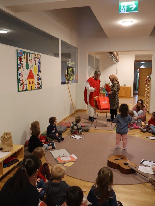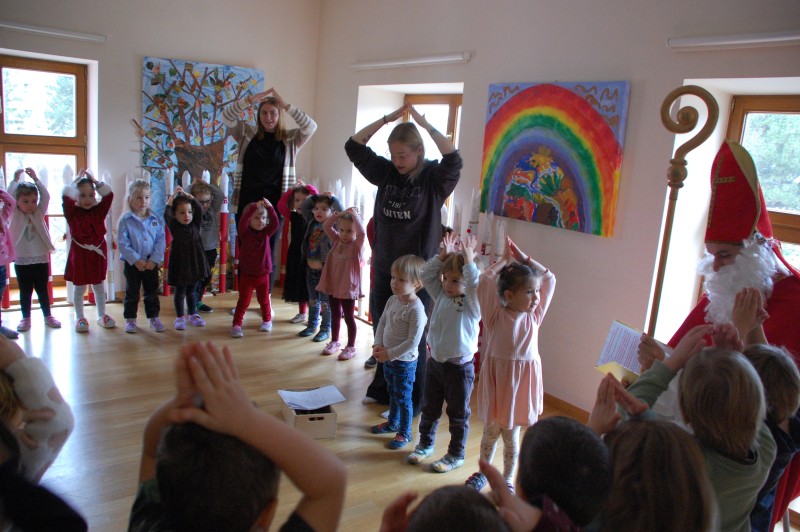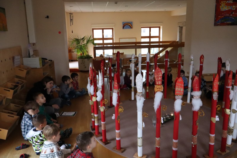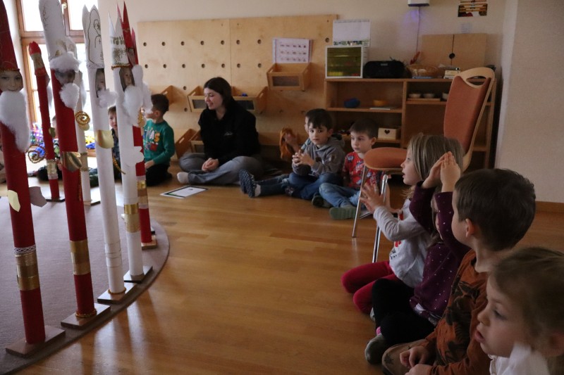 In den Gruppen gab es deshalb besinnliche Musik, Apfeljause und ruhige Gespräche und um kurz vor 10 hieß es „Wir gehen in unsere Peergroups“, denn gemeinsam wurde mit den Kindern noch der Raum gerichtet, um danach den Nikolaus herzlich willkommen heißen zu können.