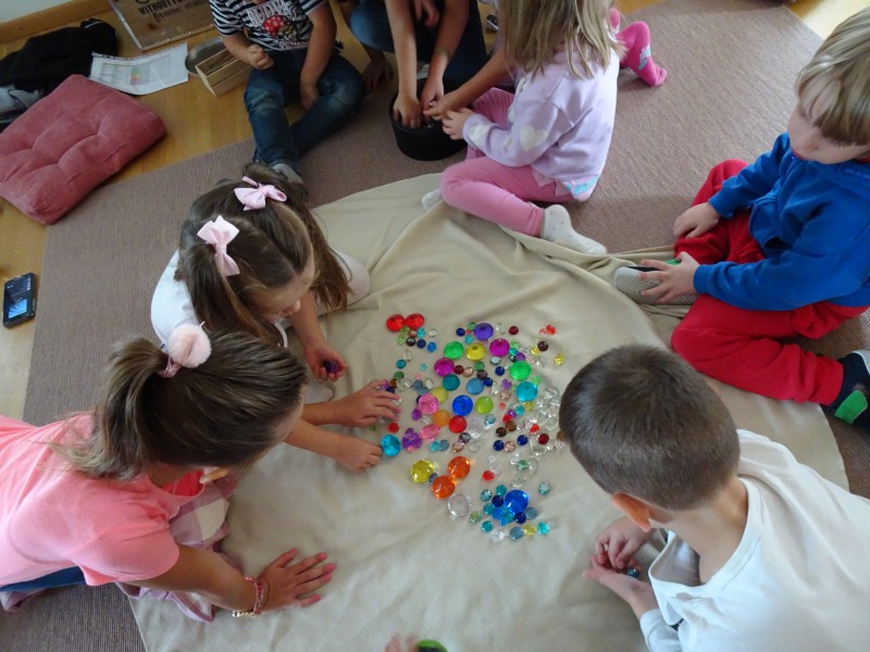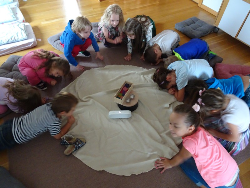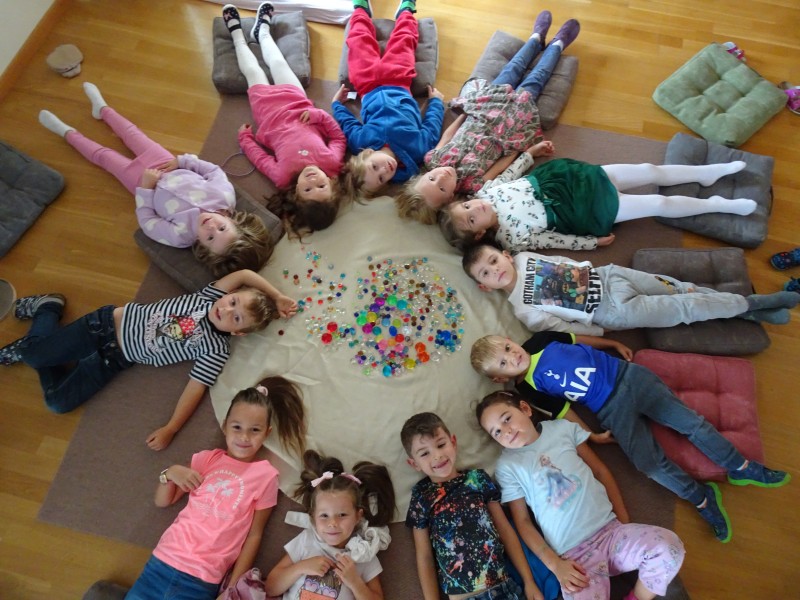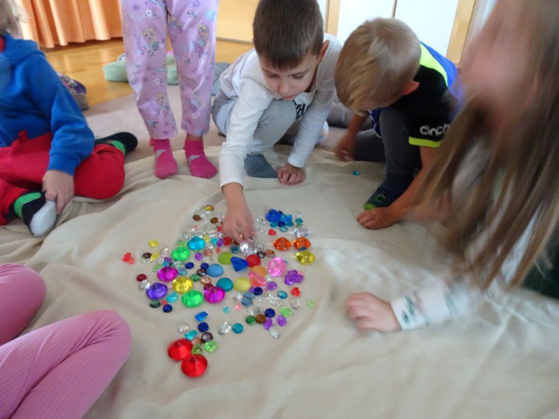 Heute haben wir die Geburtstage unserer Septemberkinder gefeiert. Die Feier stand ganz unter dem Motto „Alles was funkelt und glänzt“. Die Geschichte von Lila, und ihrer Geburtstagssuche nach den Edelsteinen führte die Kinder in eine fantasievolle Welt, in der jeder Edelstein eine besondere Bedeutung hat und schöne Erinnerungen hervorruft. Nach der Geschichte, fanden die Kinder den „Schatz“ von Lila. Damit wurde von allein gemeinsam ein großes, buntes Mandala gelegt.