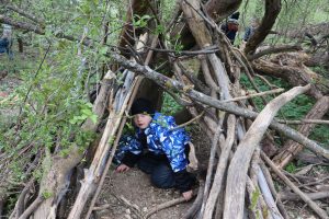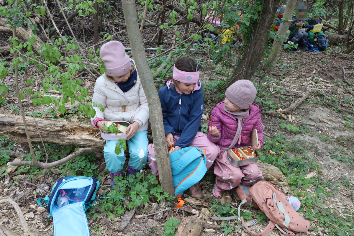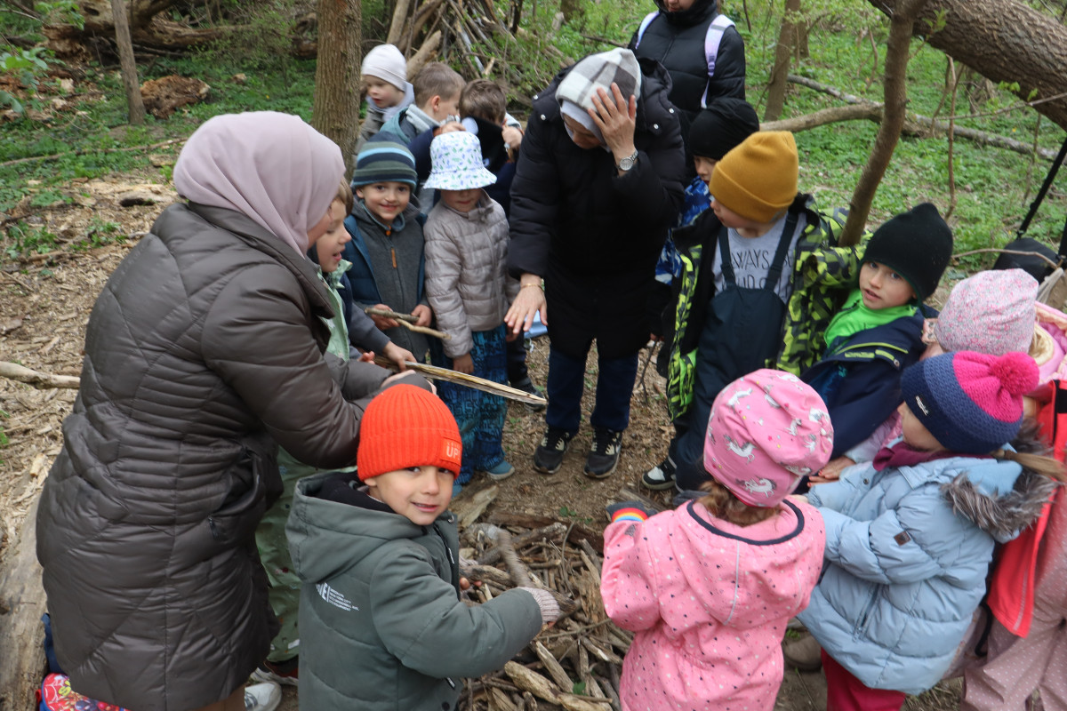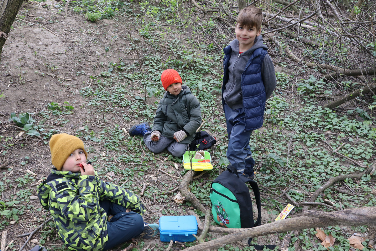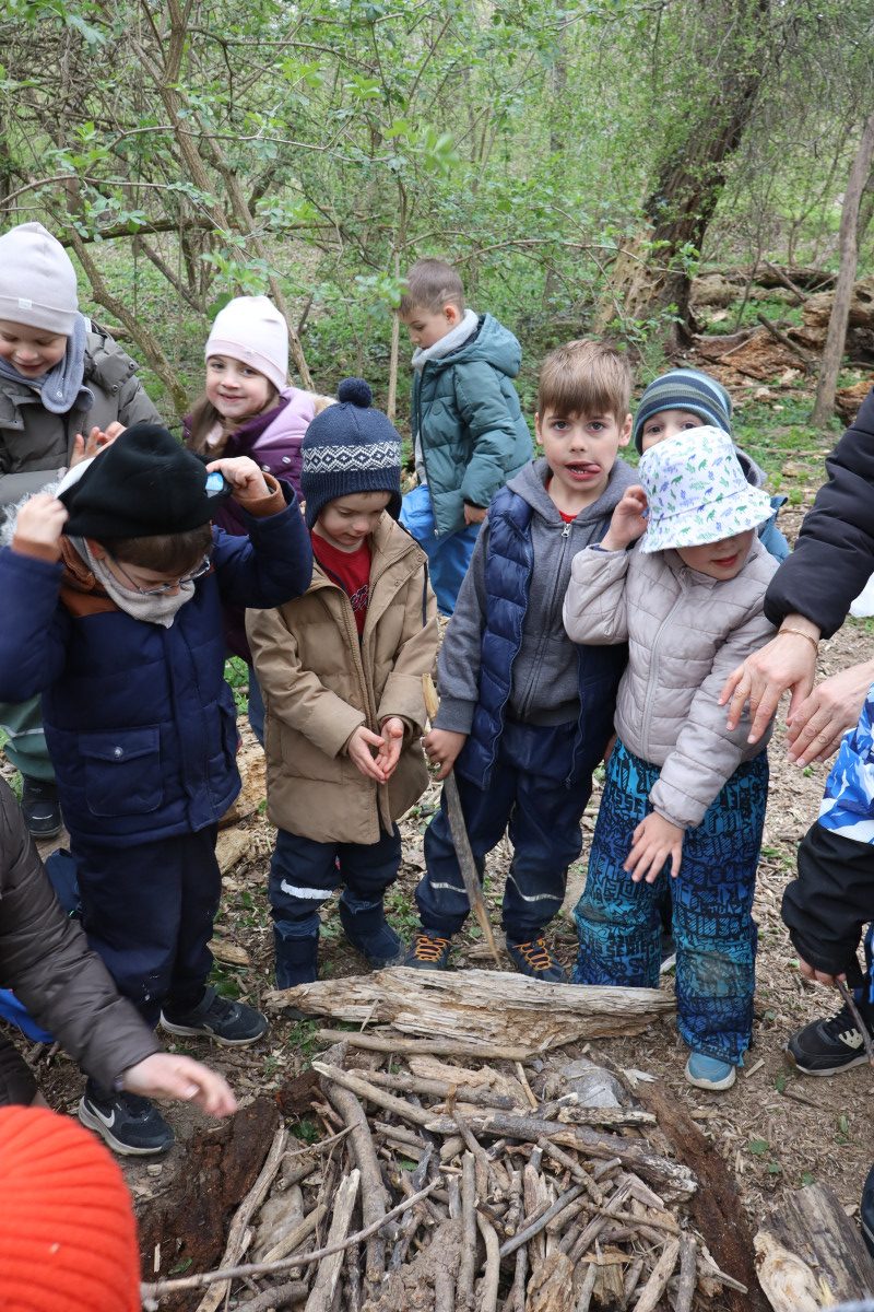 Nach drei Wochen Pause war die Freude besonders groß, als wir endlich wieder zu unserem Jausenlager in der Au kamen. Kaum angekommen, schwärmten die Kinder in alle Richtungen aus und suchten ihre selbst gebauten Plätze und „Häuschen“ auf. Mit großer Begeisterung stellten sie fest, wie schön grün alles geworden ist und wie sehr sich die Natur in dieser Zeit verändert hat.