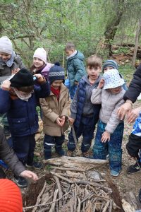 Passend zur kühlen Witterung sammelten die Kinder viele Holzstücke und bauten gemeinsam ein großes „Lagerfeuer“, an dem wir uns symbolisch wärmten. Danach wurde wieder fleißig gespielt, gebaut und entdeckt.