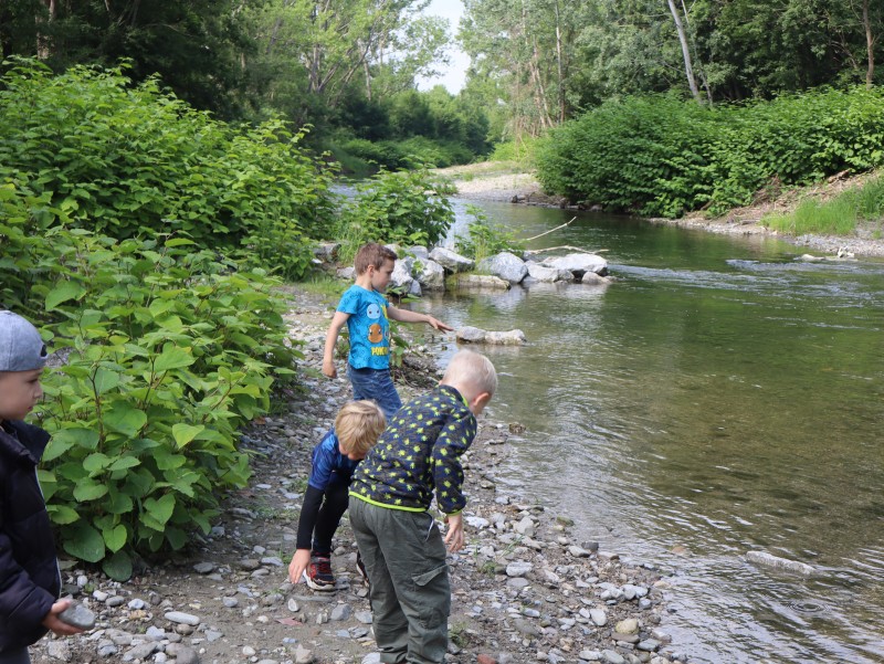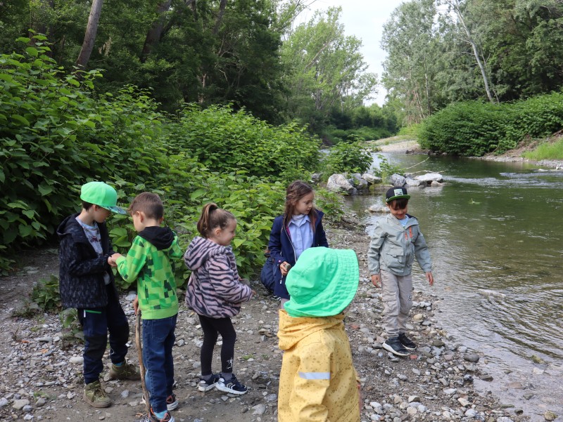 Ein besonderes Erlebnis war am Schwechat. Dort experimentierten die Kinder begeistert mit Steinen – sie ließen sie mit einem lauten „Platsch“ ins Wasser fallen und beobachteten ganz genau, wie sich das Wasser bewegt. Eine spannende Frage beschäftigte uns dabei: Können unsere Blätterschiffe durch die Steine zum Sinken gebracht werden? Mit viel Neugierde und Fantasie gingen die Kinder dieser Frage nach.