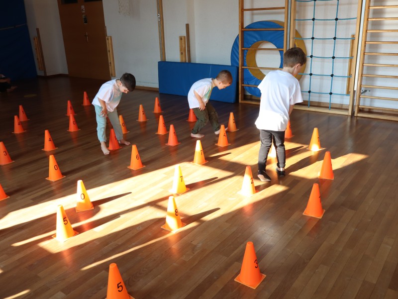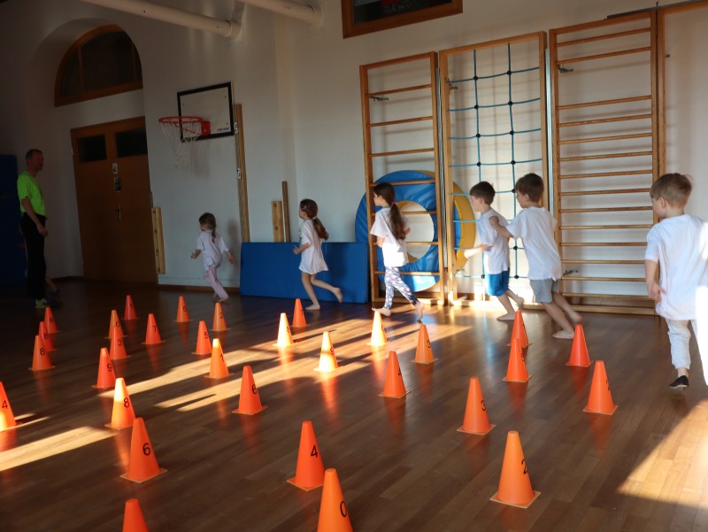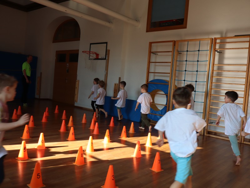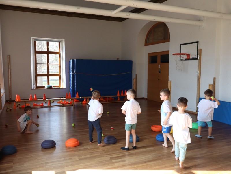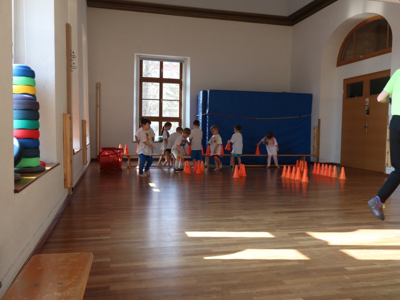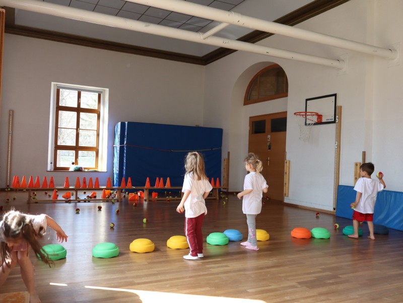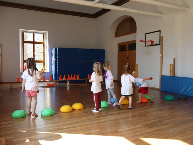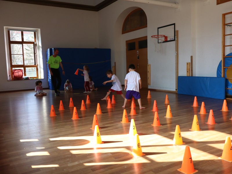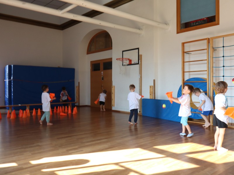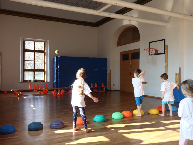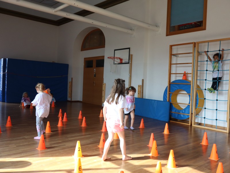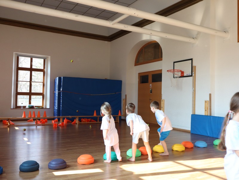 Diesen Mittwoch durften die Fünfecke Erfahrungen mit Kegeln und Tennisbällen sammeln. Heute war das genaue zuhören gefragt- denn es wurden drei Gruppen gebildet, die ihr Wissen und ihre Schnelligkeit beim Entdecken der richtigen Zahlen unter Beweis stellen durften. Anschließend durften sie ihre Fähigkeiten zum Fangen weiter trainieren. Der Tennisball wurde hoch geschossen und mit dem Kegel aufgefangen. Am Ende durften die Fünfecke gemeinsam eine Reihe an Kegeln/ Hütchen mit den kleinen Bällen abwerfen und somit das genaue Zielen verfeinern.