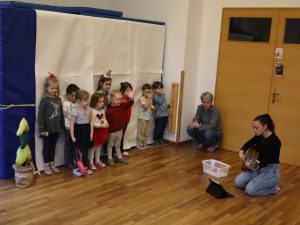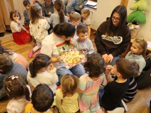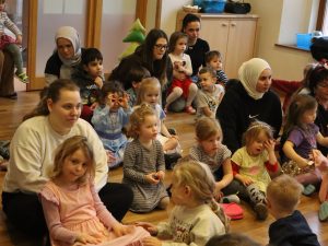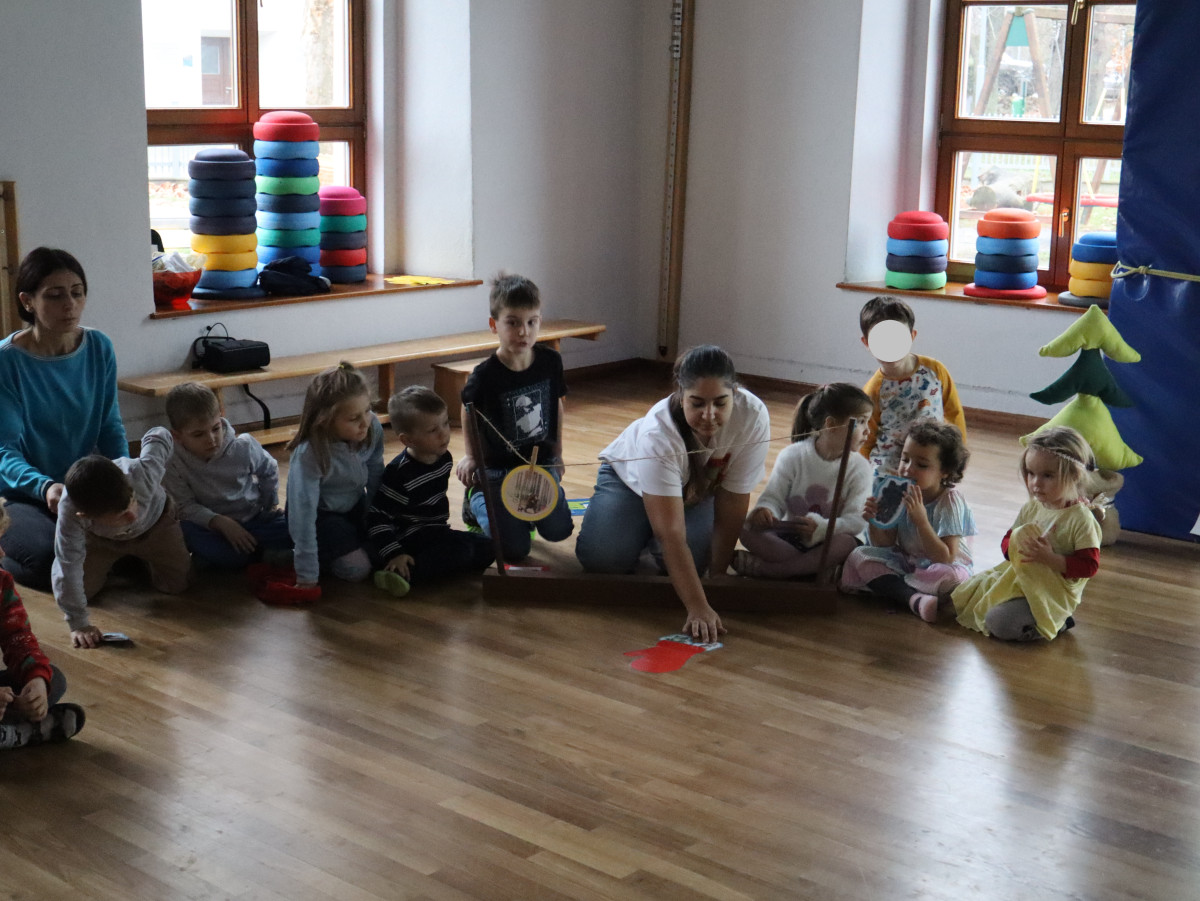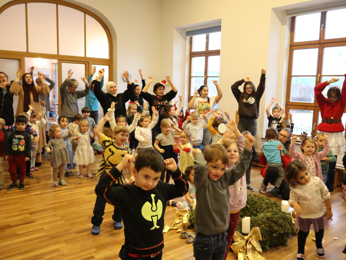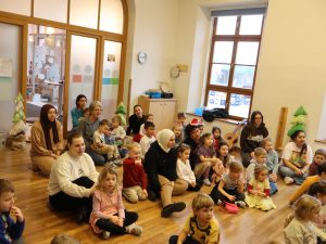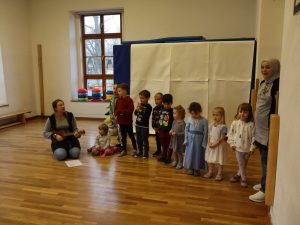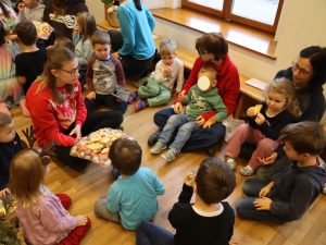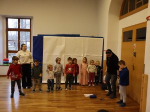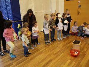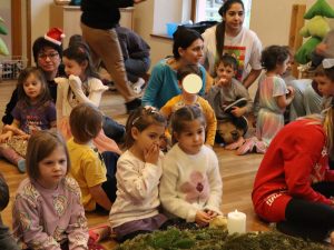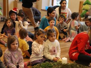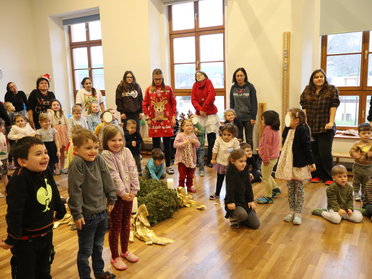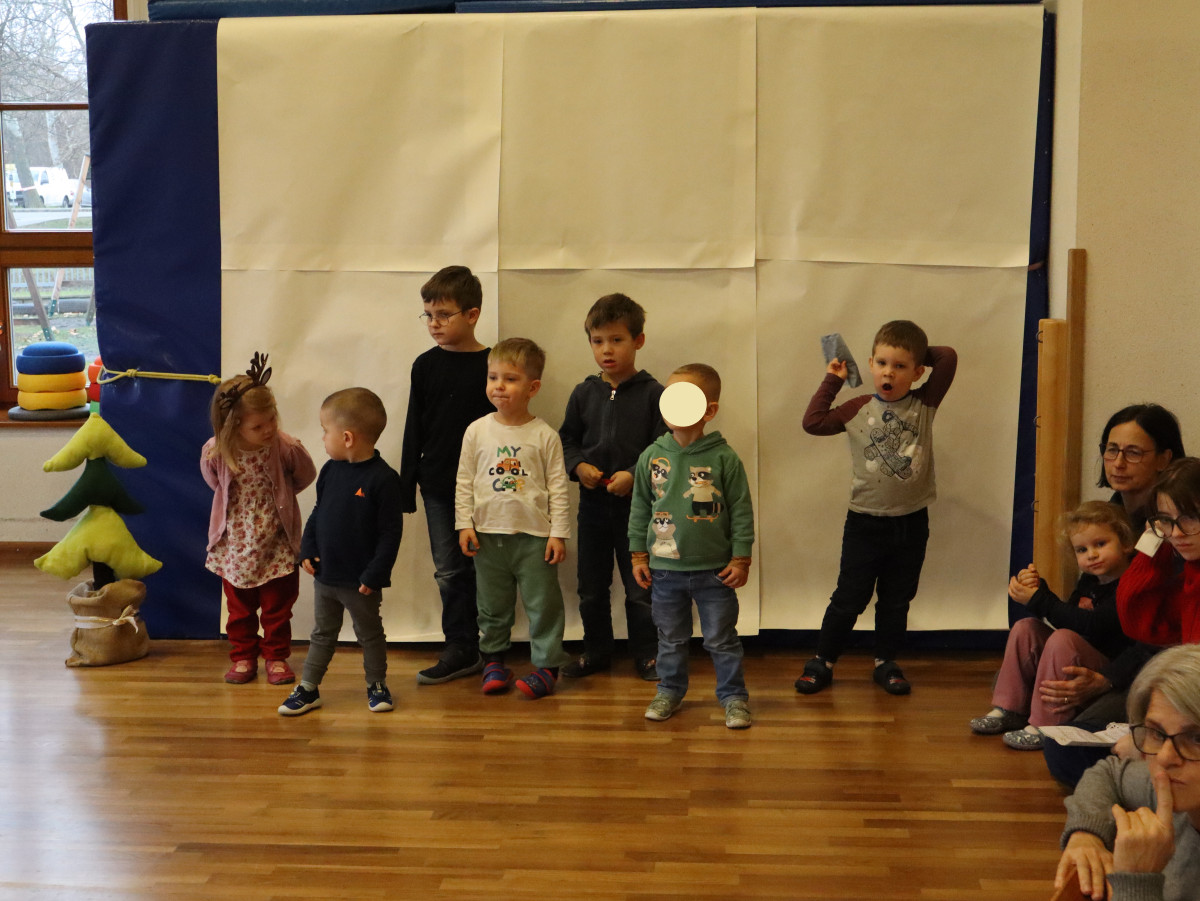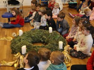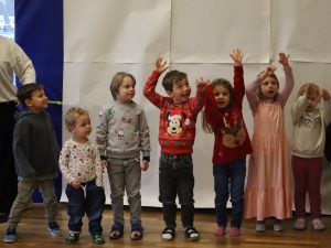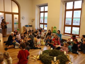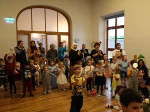 Heute feierten wir gemeinsam unsere Weihnachtsfeier, dazu bereitete jede Stammgruppe eine kleine Darbietung vor. Die Kinder genossen es auf die „Bühne“ zu gehen und den anderen Kindern etwas vorzuführen. So gab es auch der Gruppe Sausewind in Bilderbuchkino, aus der Gruppe Erde, Seifenblase, Regenbogen und Sonnenschein verschiedene Lieder und die Gruppe Heiterkeit und Wasserfall dramatisierten das Lied „In der Weihnachtsbäckerei“.