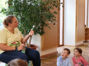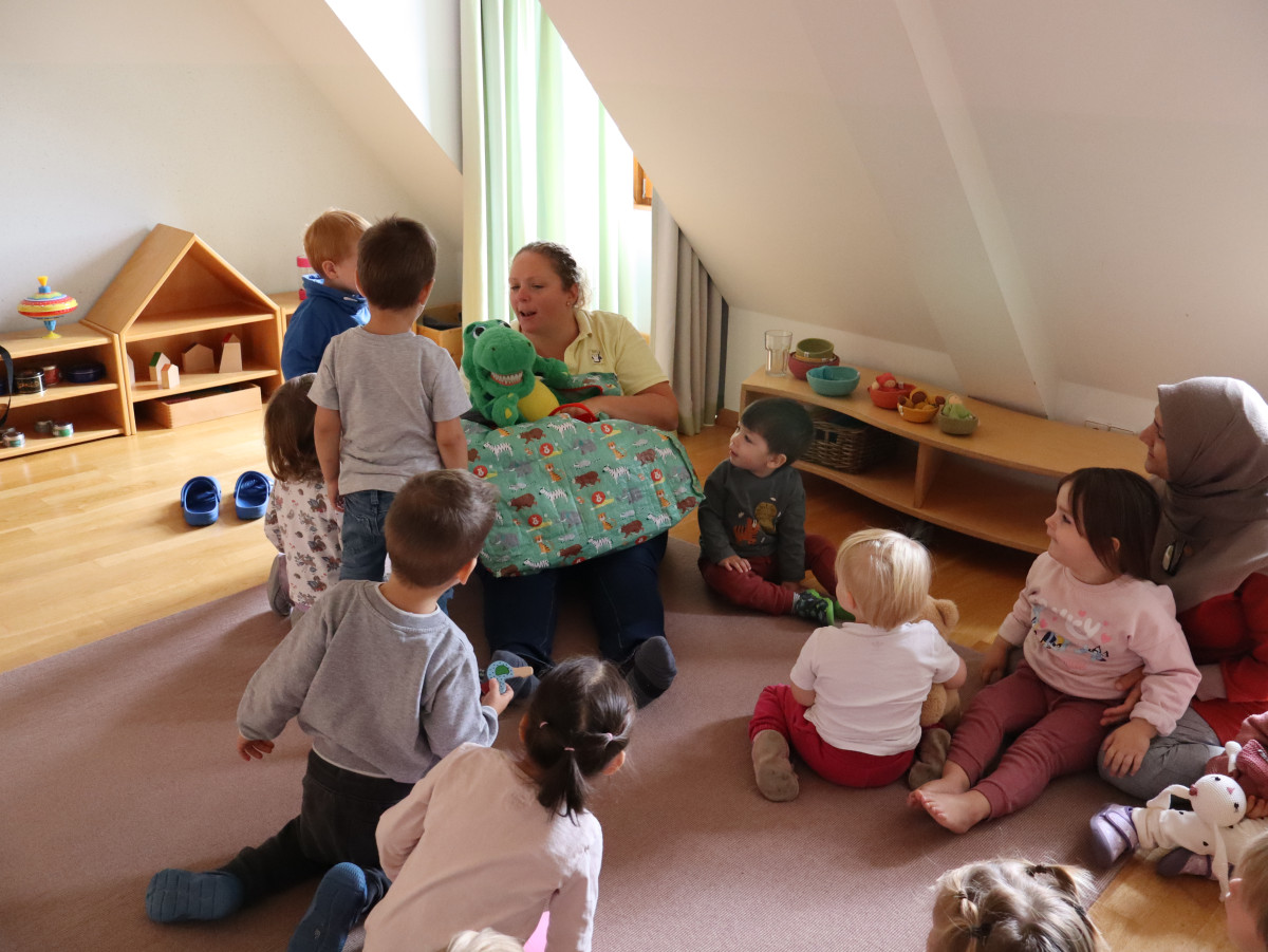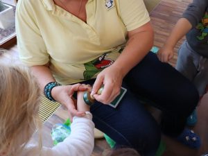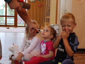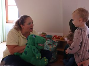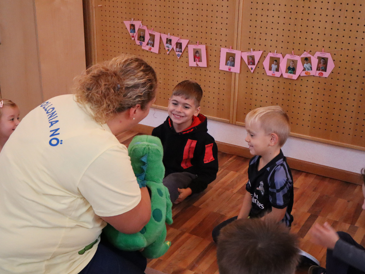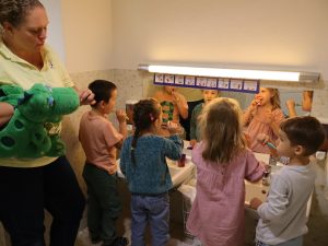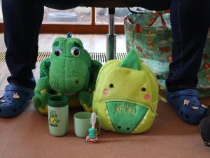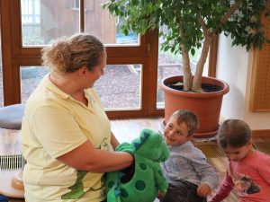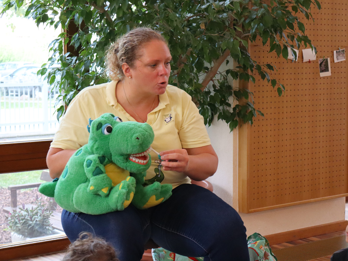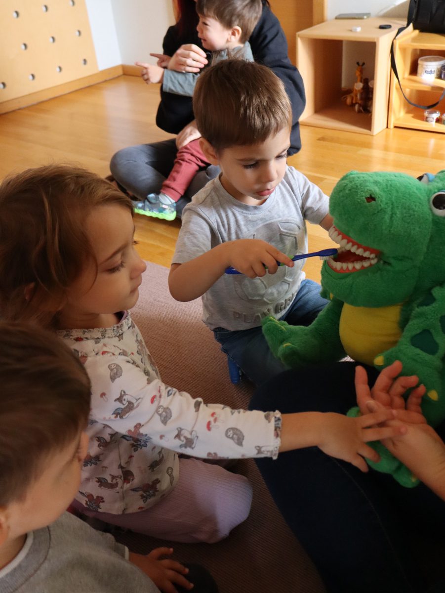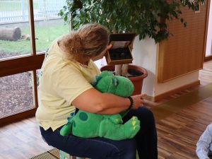 Kroko ist auch zu den Kindern ins Nest gekommen, sie durften ihn kennenlernen, streicheln und seine Zähne putzen!