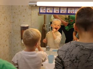 Im Anschluss haben wir die Putztechnik gleich selbst ausprobiert und gemeinsam Zähne geputzt.