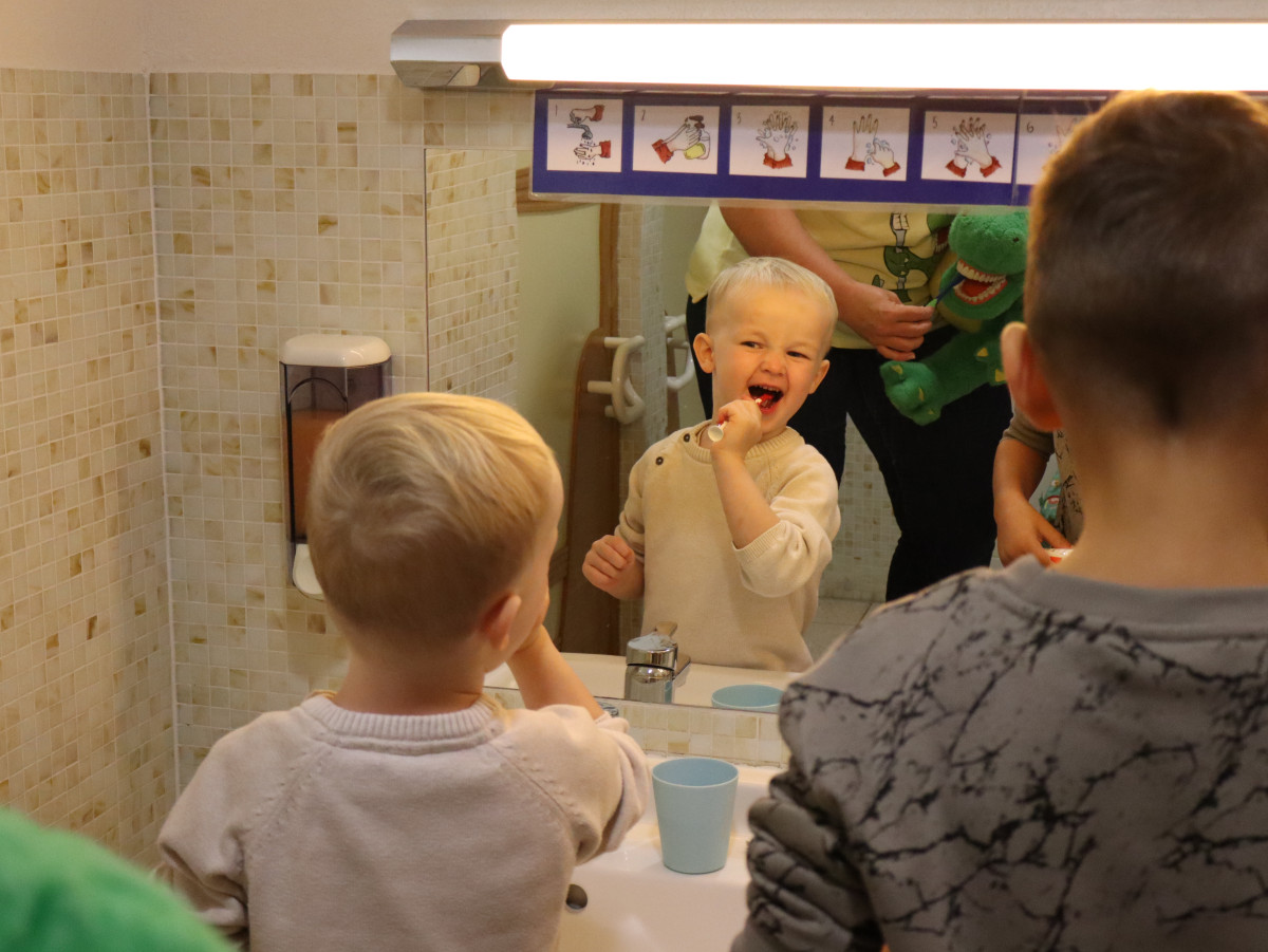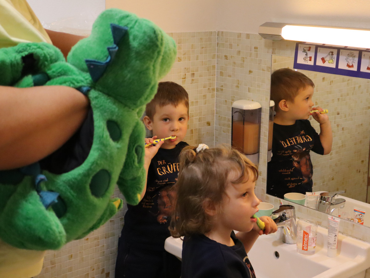 Letzte Woche war Kroko zum ersten Mal dieses Kindergartenjahr zu Besuch bei uns im Kindergarten. Er hat uns die Kai – Putztechnik gezeigt, dabei putzen wir zuerst die Kauflächen, dann die Außenflächen und zum Schluss die Innenflächen der Zähne. Immer von Rot nach Weiß, also vom Zahnfleisch zum Zahn!