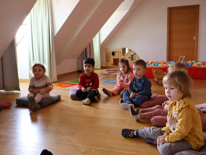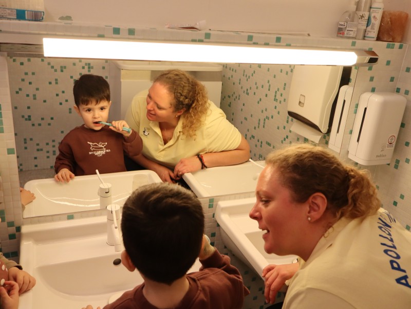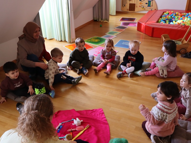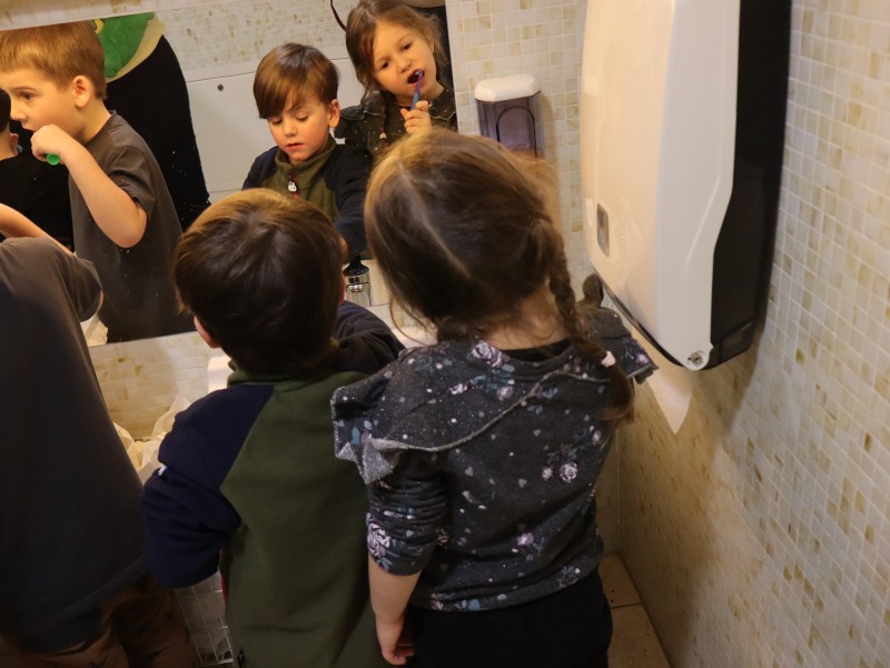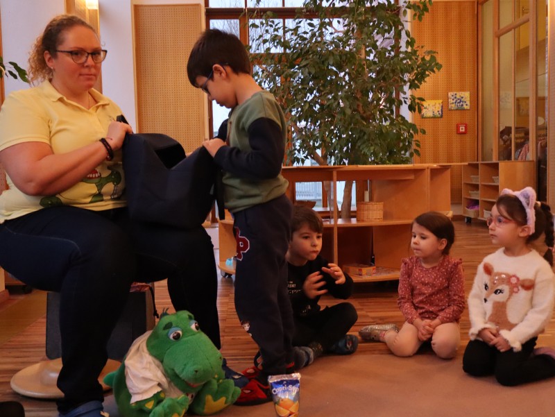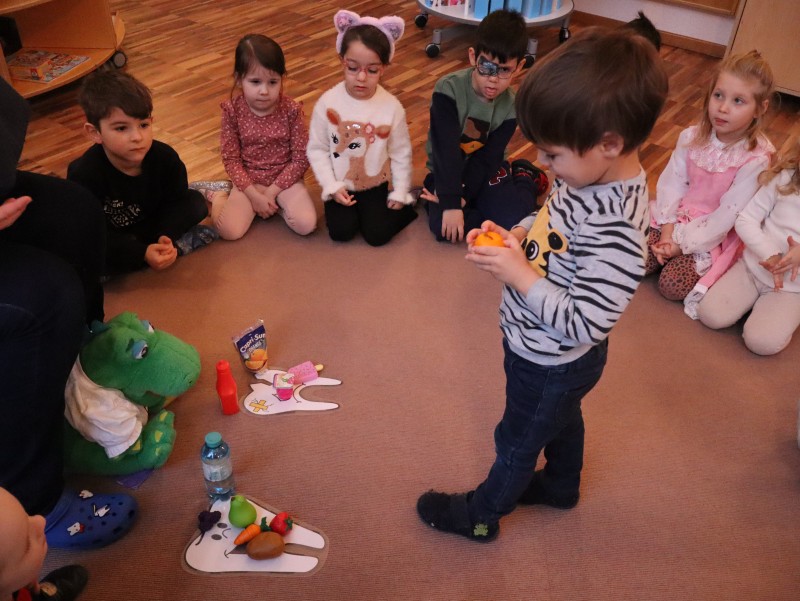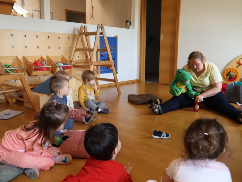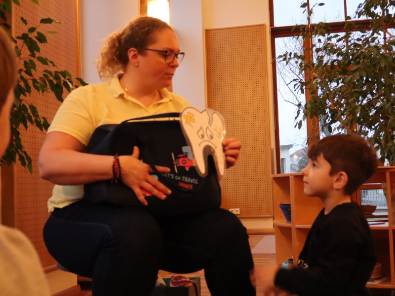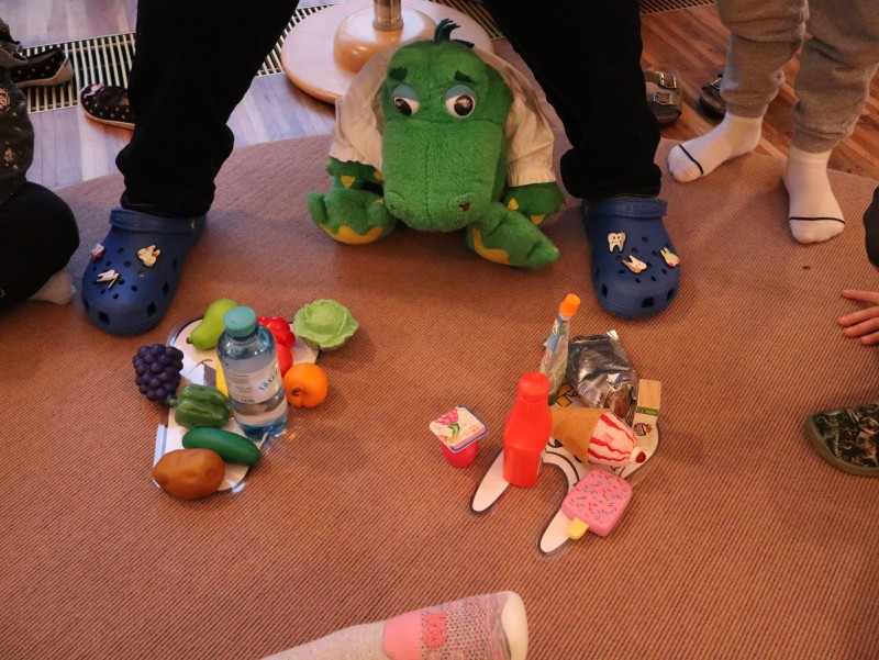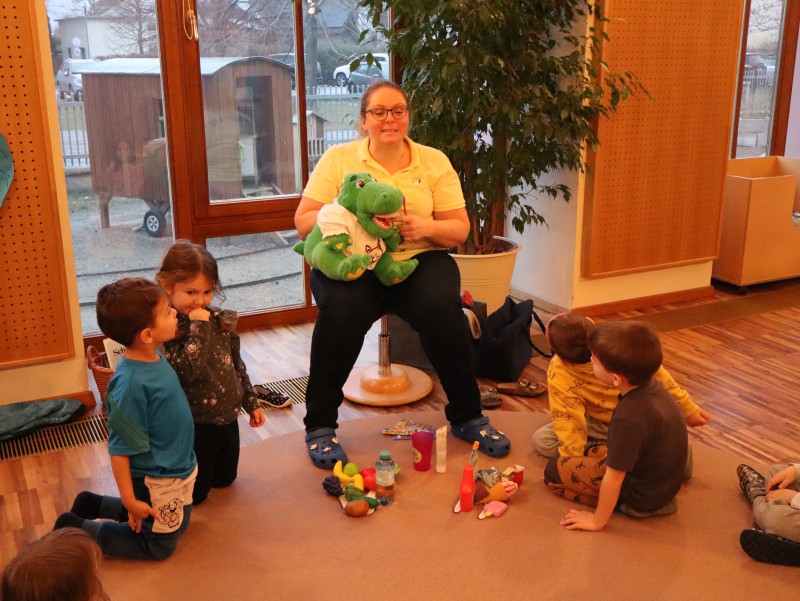 Kroko, war zu Besuch und brachte den Kindern im Wintergarten spannende Neuigkeiten aus seinen Weihnachtsferien mit. Er erzählte ihnen, was er alles gegessen hatte, und die Kinder durften die verschiedenen Lebensmittel in „schädlich“ und „nicht schädlich“ für die Zähne unterteilen. Ein wichtiger Teil des Besuchs war auch das Zähneputzen: Kroko zeigte den Kindern, wie man richtig die Zähne putzt, um sie gesund zu halten. Wer sein Zahnputzzeug dabei hatte, konnte im Waschraum zusammen mit Kroko das Zähneputzen üben.