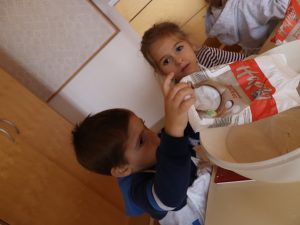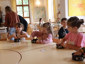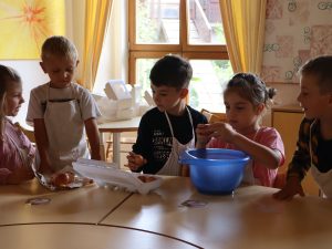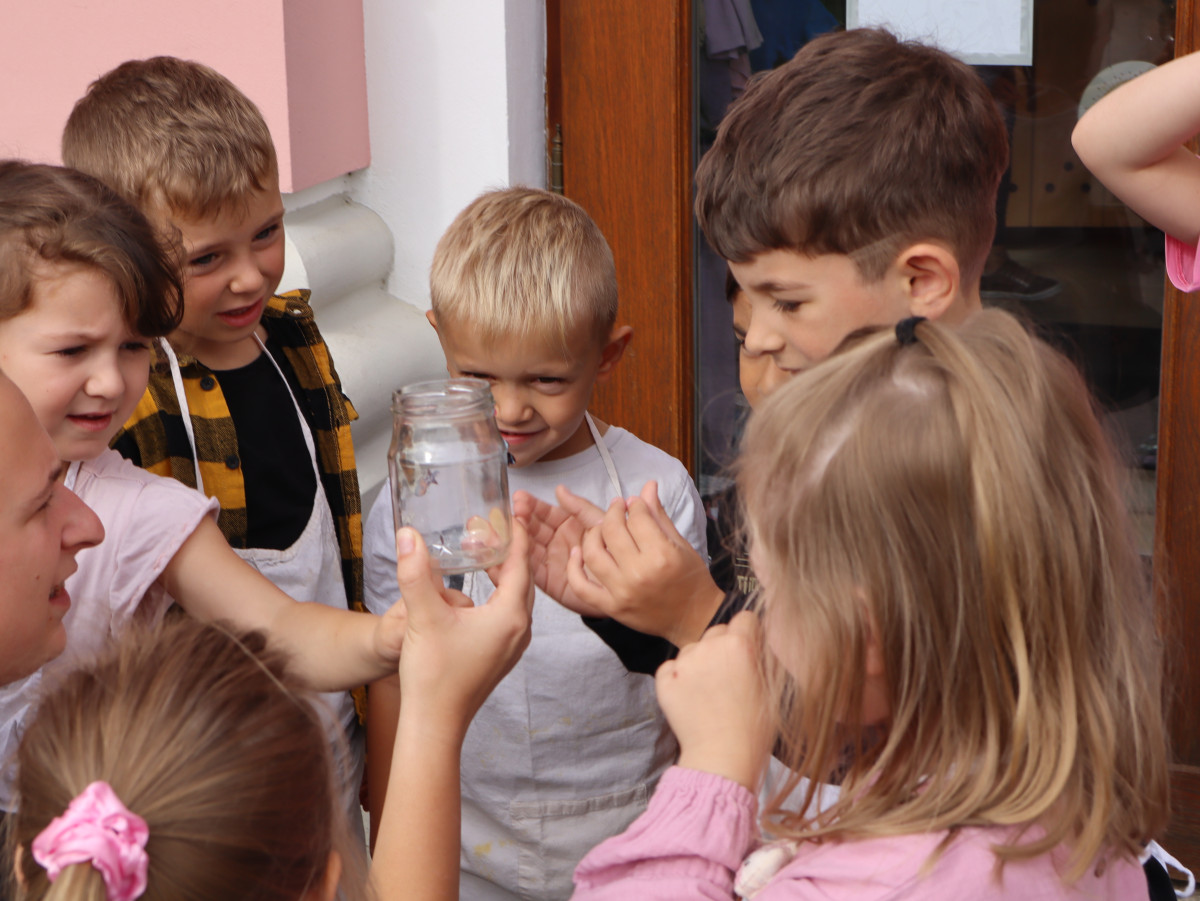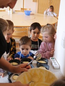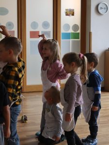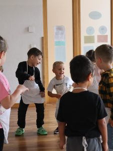 Zu Beginn konnte jedes Geburtstagskind einen eigenen kleinen Kuchen backen. Während der Duft aus der Küche schon Vorfreude weckte, tanzten die Kinder fröhlich zu Geburtstagsmusik und lauschten der Geschichte von Emma, die an ihrem Geburtstag mit ihren Freunden Herzenswünsche aussprach und sie symbolisch in die Welt hinaus schickte. Inspiriert von dieser Idee, durfte jedes Kind seinen eigenen bunten Stein auf ein großes Wunschglas kleben. Danach sprachen die Kinder – ganz leise oder laut – ihren persönlichen Herzenswunsch hinein. Als alle Wünsche gesammelt waren, gingen wir gemeinsam nach draußen, um sie symbolisch „davonfliegen“ zu lassen – ein stiller, berührender Moment, den die Kinder mit leuchtenden Augen begleiteten.