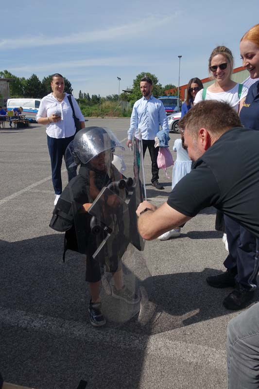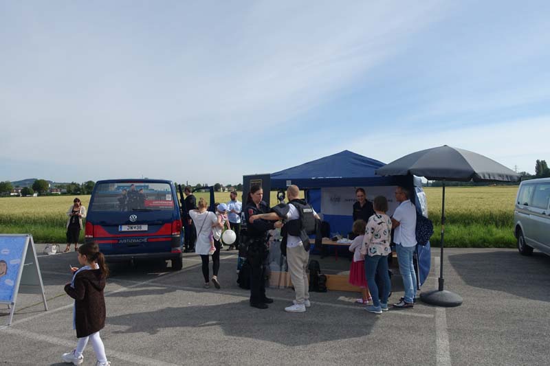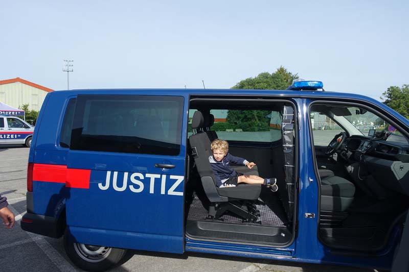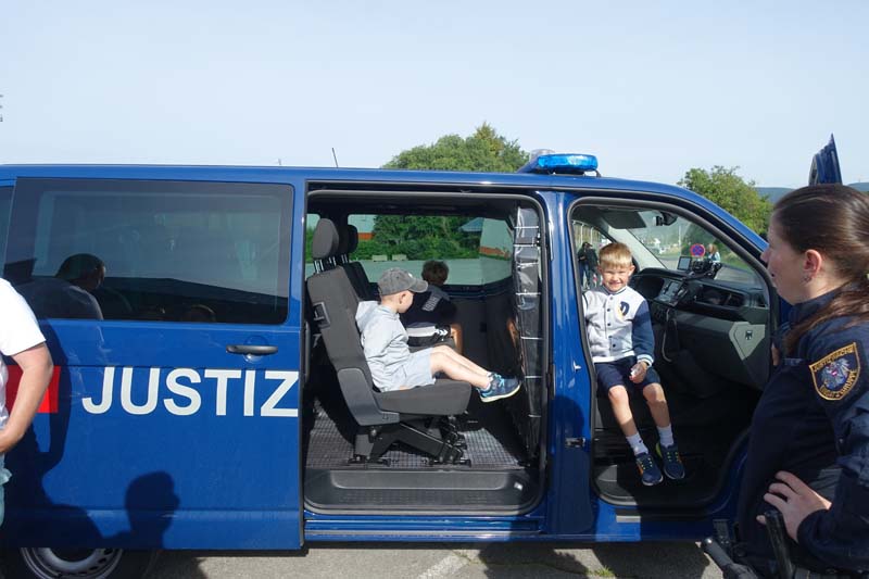 Bei der Justizwache hatten Groß und Klein die Möglichkeit die schwere Schutzausrüstung anzulegen und sich in ein Einsatzfahrzeug zu setzten.