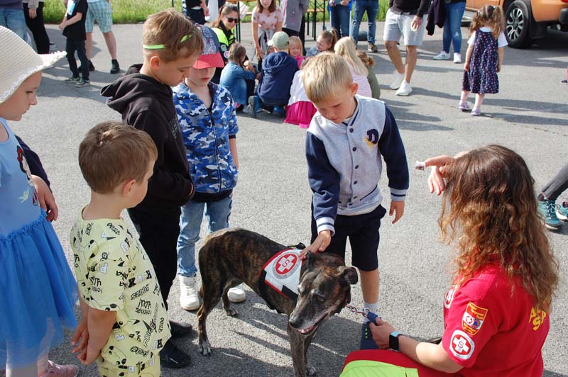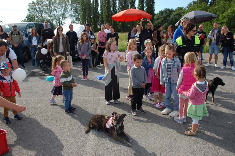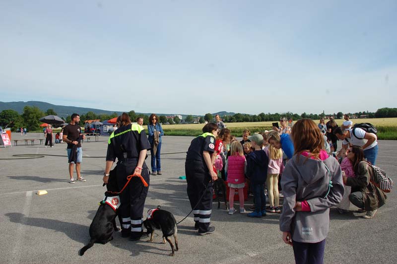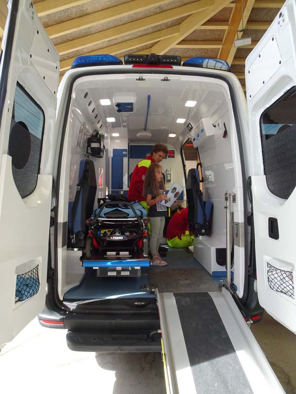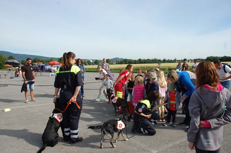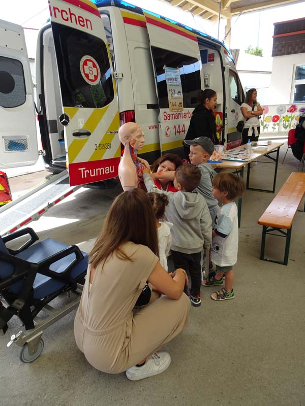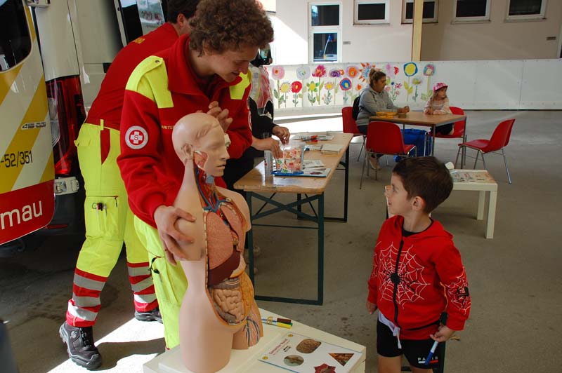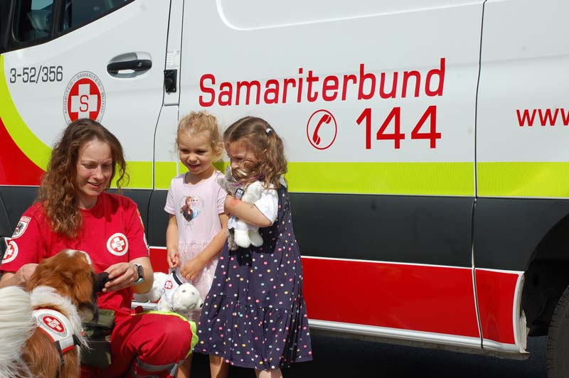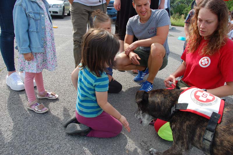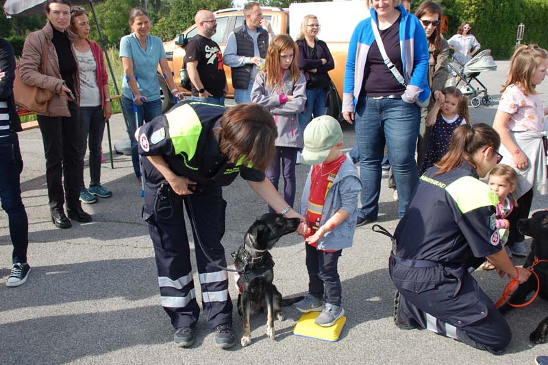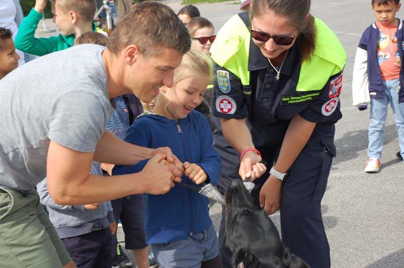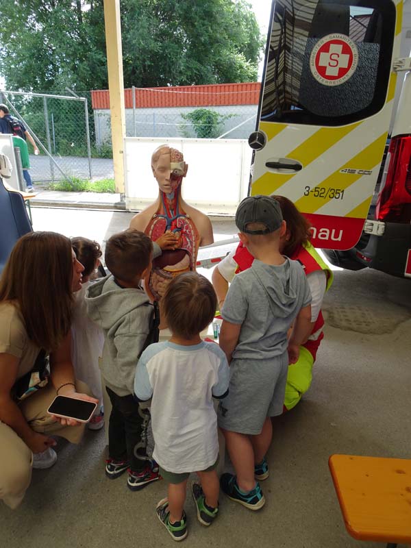 So konnten die Familien beim Samariterbund nicht nur einen Rettungswagen von innen erkunden, sondern auch an einer Puppe genau betrachten welche Organe in unserem Körper uns am Leben erhalten. Die Hundestaffel zeigte den Kindern unter anderem wie die Hunde im Ernstfall Personen wiederfinden können.