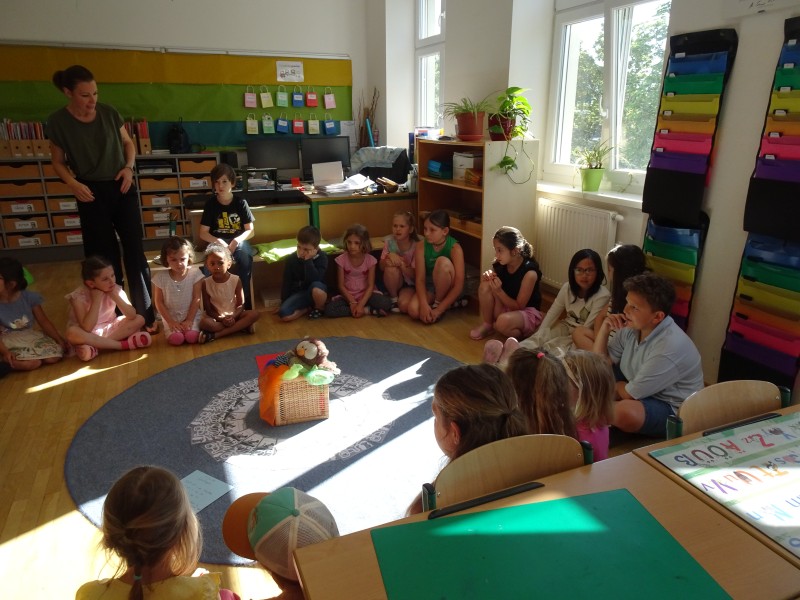 Eine Station war das Kennenlernen der „Drachenklasse“, somit konnten die Kinder in die 1B hineinschnuppern und bekamen etwas Schultag mit, danach wurde das Bilderbuch „Die Geschichte vom kleinen Siebenschläfer der seine Schnuffeldecke nicht hergeben wollte“ gelesen und bei der Dritten Station wurde das Buch dramatisiert.