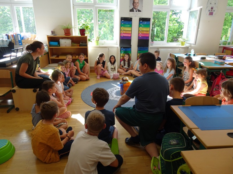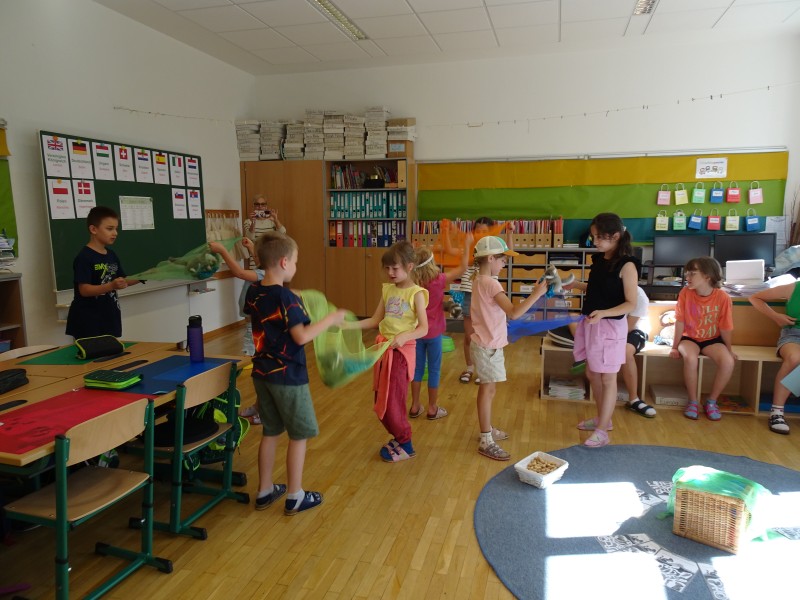 Zur Begrüßung sangen wir gemeinsam das Lied „Unsere Welt die ist so bunt“. Danach bildeten sie gemeinsam mit der Partnerklasse drei Gruppen die im Wechsel 3 Stationen erleben durften.